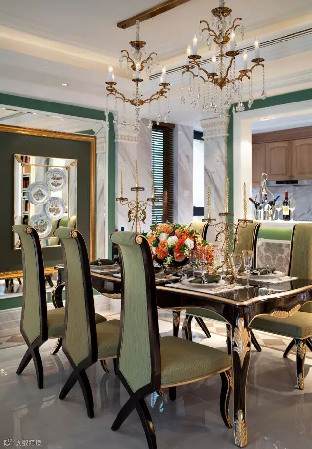 ▲餐厅空间布局与陈设大气端雅、激情华丽,欧式古典浪漫艺术的气氛展露无遗,精美的餐具有序的陈放凸显讲究的西式生活情调,橘色与绿色通过晶莹的水晶杯,透射出一幕诱人的私人盛宴。