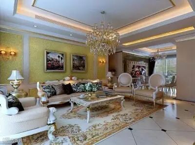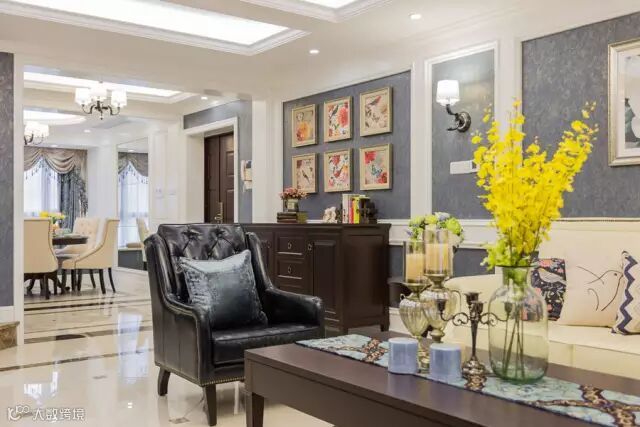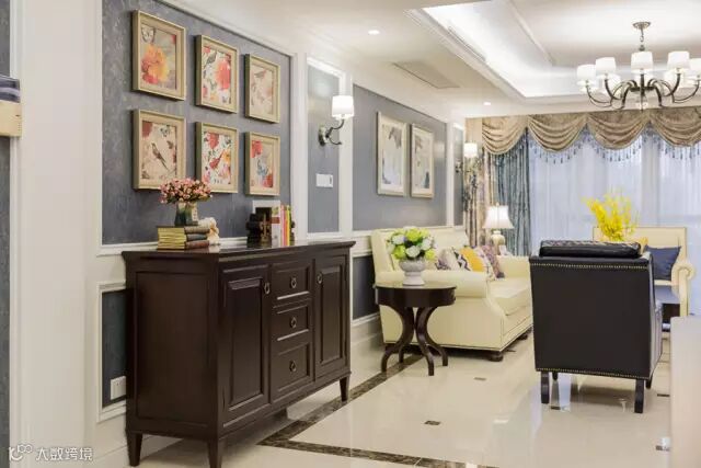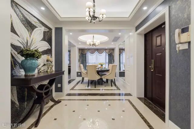 ▲玄关背景的大花颇有先声夺人之势,奠定了整屋的基调,进门右侧即餐桌 ,圆弧的吊顶让空间更加宽阔。