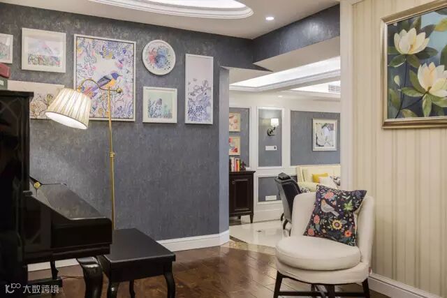 ▲灰色的护墙板上挂着大大小小的彩色油画,透露着主人艺术的气息。