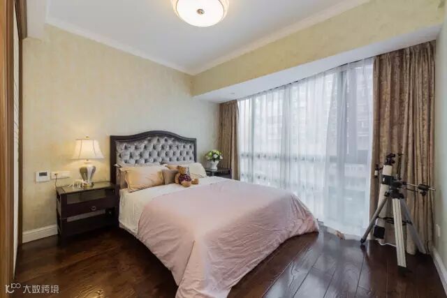▲卧室的空间并不很大,没有浮夸的床背景,依然采用简约的壁纸去填充, 干净温馨。