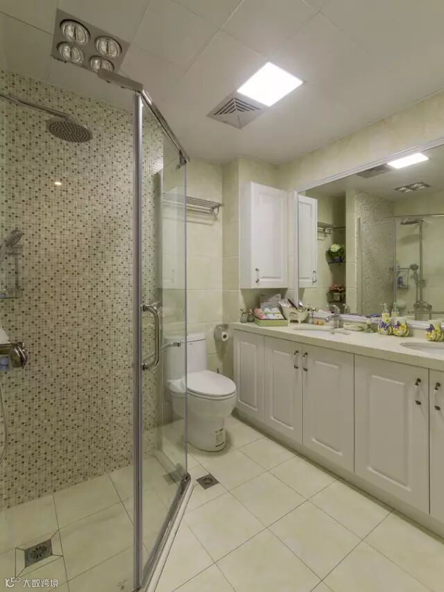▲波点墙砖成为了整个卫生间的亮点,两个台盆可以同时使用,避免了拥挤 。