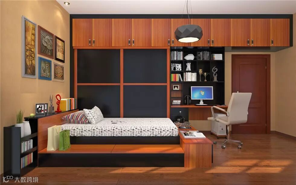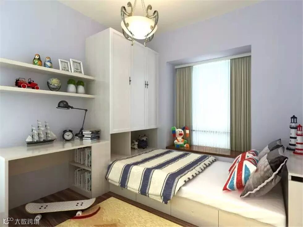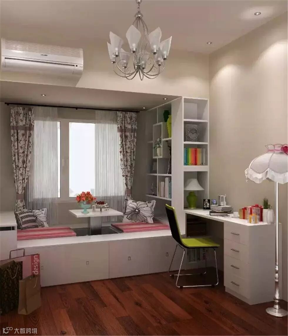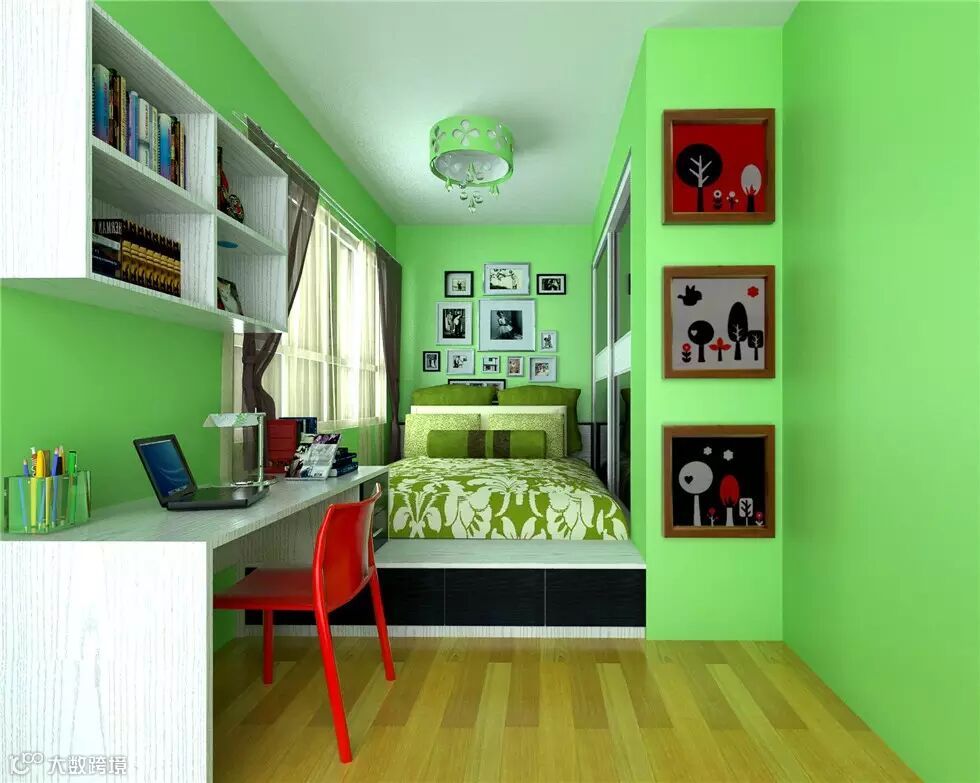像这种不规则的空间,可以改造成卧室书房,受空间的限制,这样榻榻米床显得更为合适。整体绿色健康的格调,拉进了与自然的距离。