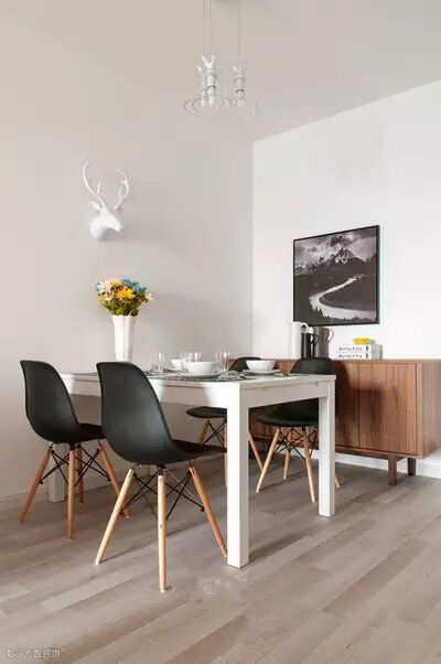 墙上的鹿头雕塑,为这个开放式的餐厅,带来了些许野性与活力,白色陶瓷的材质同时又让人感觉到神圣和纯洁。