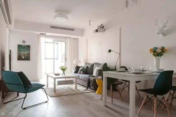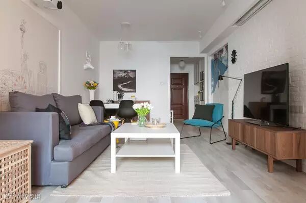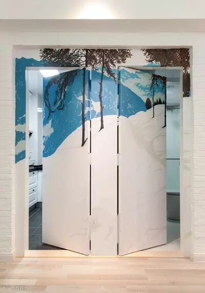 原结构中出现在客餐厅里的卫生间和厨房门洞被设计师巧妙的用手绘方式隐藏起来,安静淡雅的穹蓝色风景,搭配同色系的欧美简约家具,可以保持氛围的芳香统一。