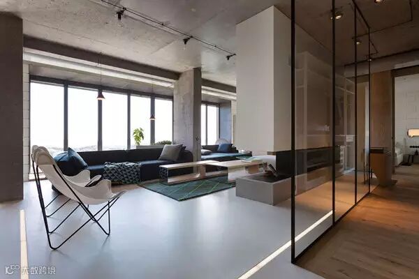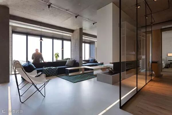 裸露的混凝土天花板与金属色泽的地板相互辉映,个性鲜明,有些硬汉气息。大面积落地式窗户,不论是想看星星,看月亮,还是看小溪,看草地,周边风景一览无遗。