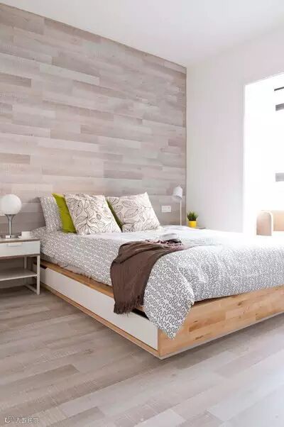靠墙与地板都选用了大地色的木质材质,让卧室给人舒适、放松的感觉。设计师秉承着“少即是多”的态度,搭配了一小盆绿植,去繁留简,返璞归真。
