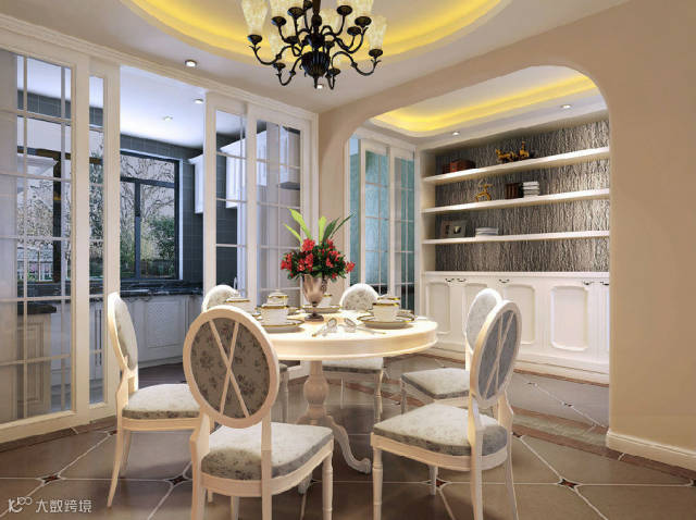 独立的小餐厅一般难以形成良好的围合式就餐环境。此法针对这一问题,在小餐厅的上方天花上做小型的方型吊顶以压低就餐空间,营造餐厅的围合式就餐气氛;同时将吊顶和吊灯合二为一,由于吊顶的作用,此处可以选择价格便宜的吊灯,但借助吊顶的气势,完全可以烘托就餐的主题,并且满足了空间、照明等诸多功能需求。
