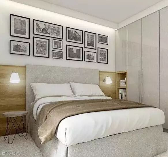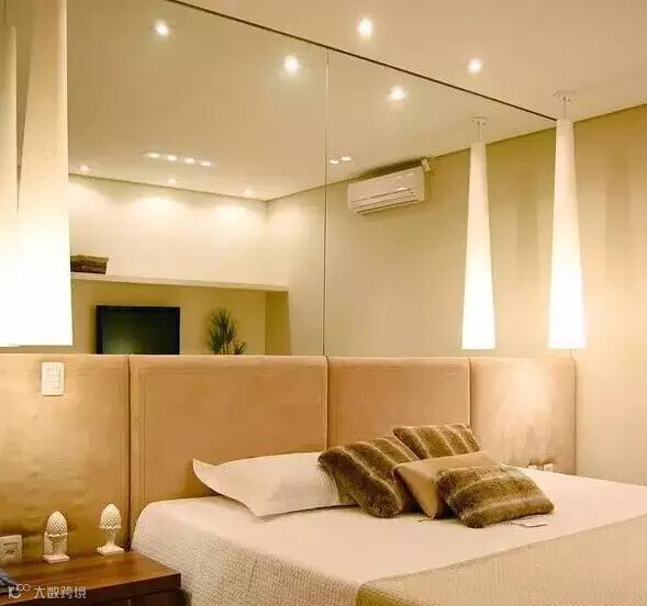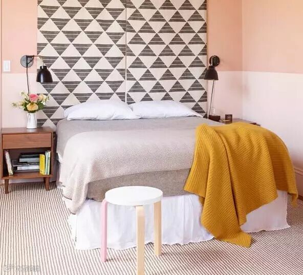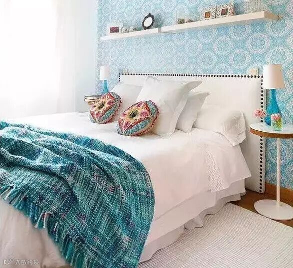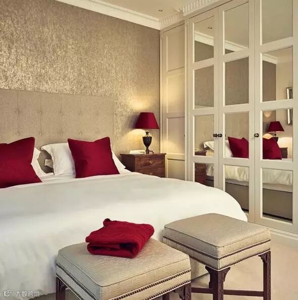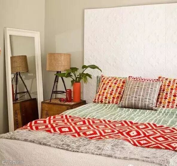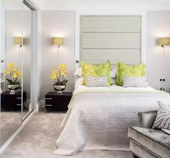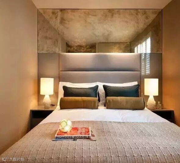 一个超大的床头板,镜子墙,背景墙,水平的装饰放置在床头板的上方。一个超大的床头板或背景墙将退出整个房间的关注,往往占主导地位的是小卧室。一面镜子墙通常可以在视觉上拓展空间,而一个水平条纹却能在视觉上扩大空间。
