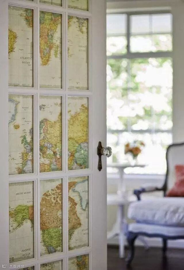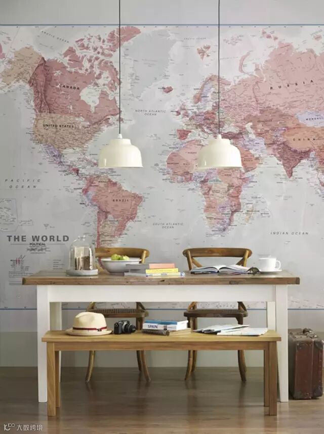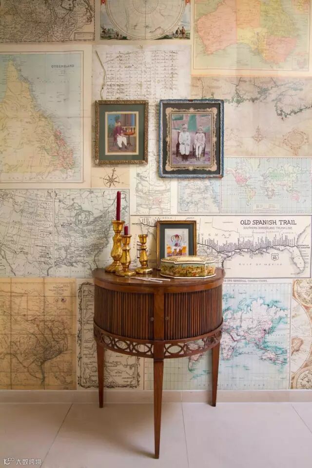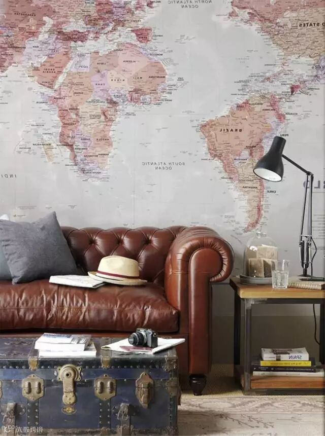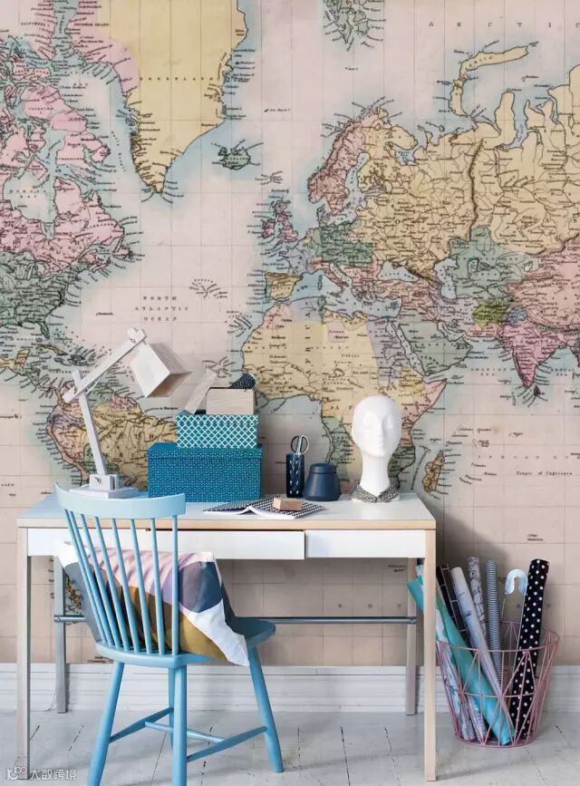 可以用来作为墙纸装饰家中平淡无趣的白墙,也可以把地图元素用在窗帘、壁画、门,以及灯罩、抱枕等细节处,选用带有做旧笔触风格的地图还会为家里渲染上一分复古的意味,如果你也爱这样的设计,那么不如试试用它来装饰自己的家吧?