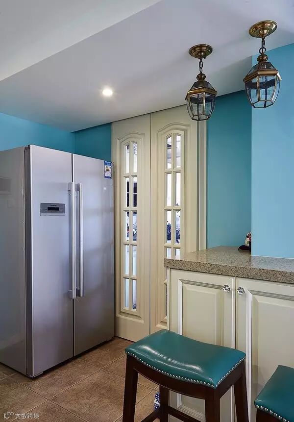 ▲ 双开门冰箱和吧台一起放置于厨房门口