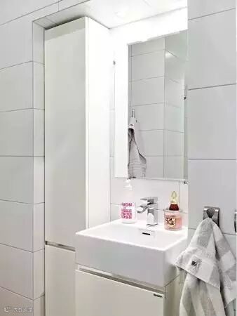 窄长条的收纳柜、小洗手池。因地制宜,很好的利用了这个凹陷的小空间。色彩和灯光是两大利器:如果你的卫生间很小预算也不多,那请你一定要善用色彩和灯光这两件东西。