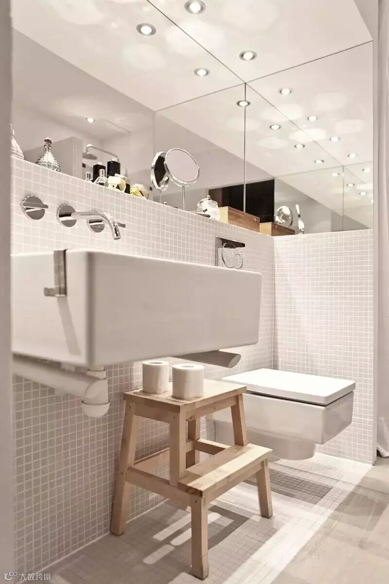 充分利用镜子,让空间看起来比实际大很多!图中其实只安装了四盏小射灯,你相信吗?角落空间太小,就用三面镜子围起来,是不是看起来超级大呢!