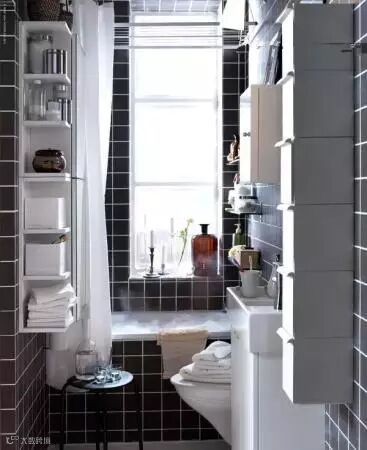 极简的黑白设计,空间虽小,但看起来却井井有条,一点都不凌乱拥挤。如果你家的卫生间是狭长版的,可以选择这种窄长的洗手池,让空间显得更大些。