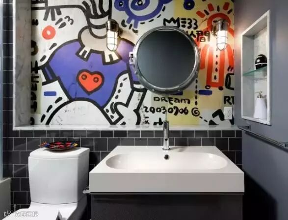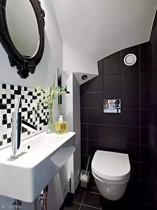 黑色的墙,显得格外严谨低沉,如果用彩色的隔板,或者粗狂的墙画点缀,就会比较活泼欢乐,给沉闷的洗手间带来不少生气,再加上一些小盆栽,展现了一幅生机勃勃的景象。