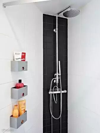 角形小空间,只要合理利用就不会被浪费。值得一提的是黑色瓷砖的运用,白墙中长长一条黑色,让空间有一种纵向延伸感,而且,作为淋浴器的背景墙,更突显银色五金件的光亮质感。