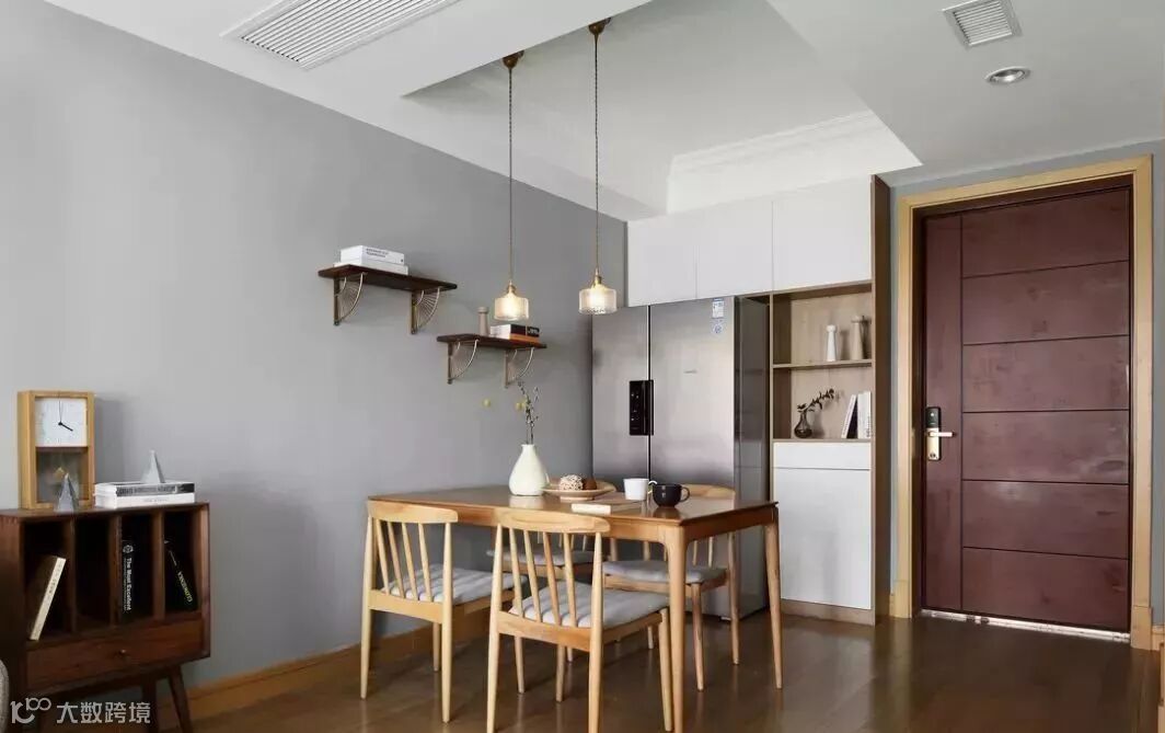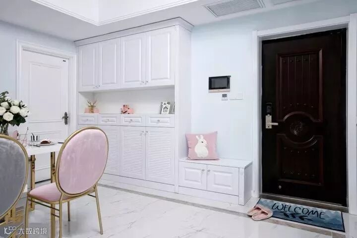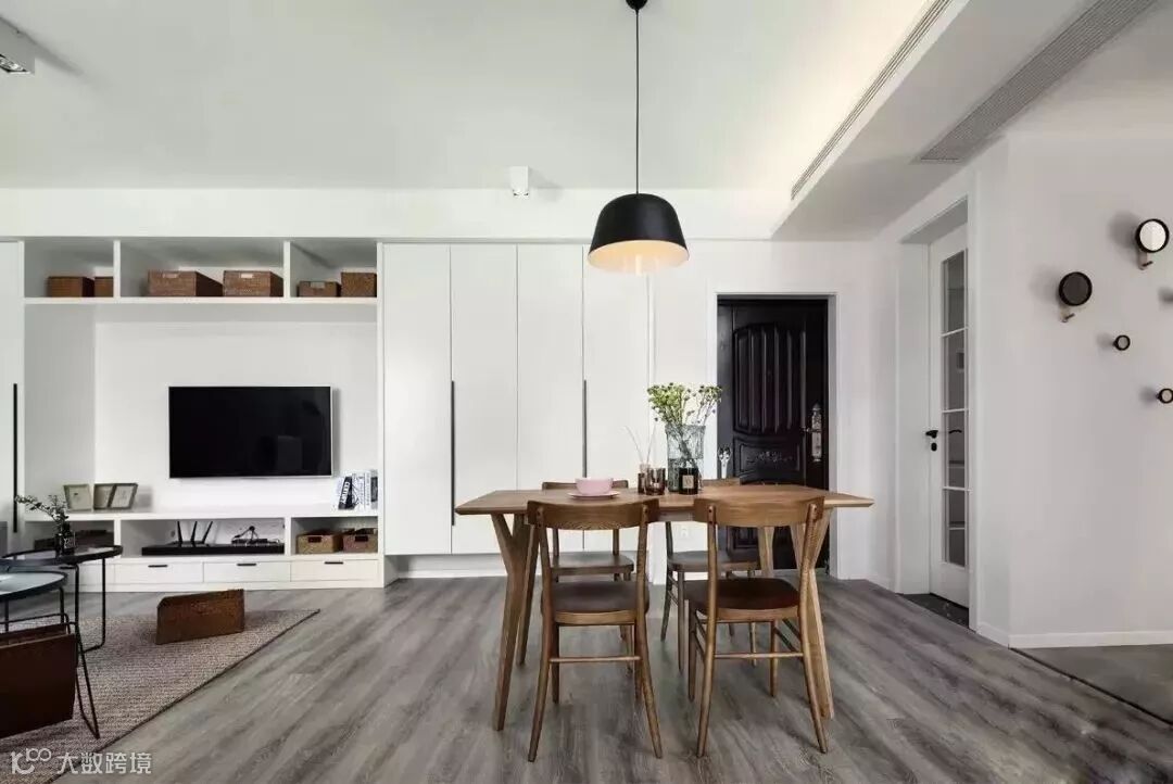 进门就是餐厅的话,由于大门太靠近这一侧的墙壁,做大柜子会阻碍空间动线,所以只能在大门右侧摆放小体量的鞋柜。