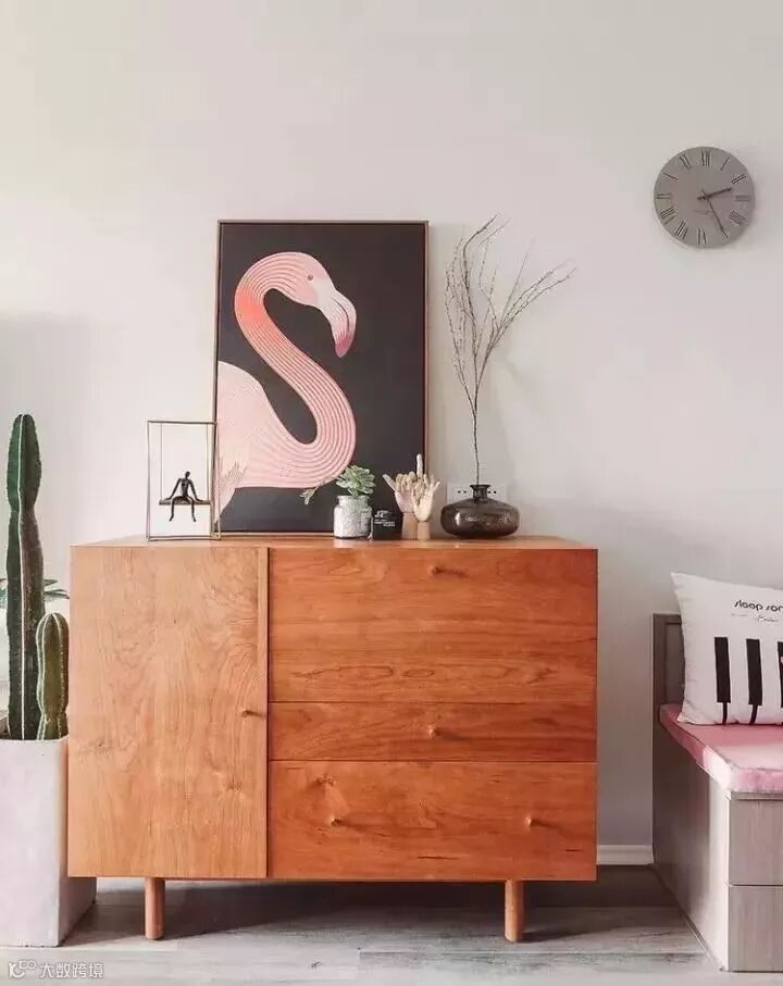 进门就是一条横向的过道,连接餐厅和客厅,但是过道空间窄,两边的墙壁面积也不大,好在大门对面也是墙壁,这时可以在这面墙前摆上一个小巧的收纳柜。