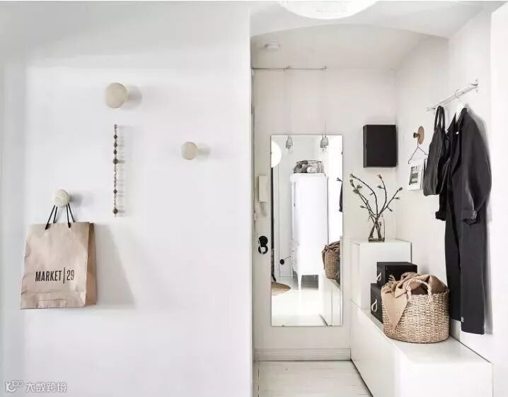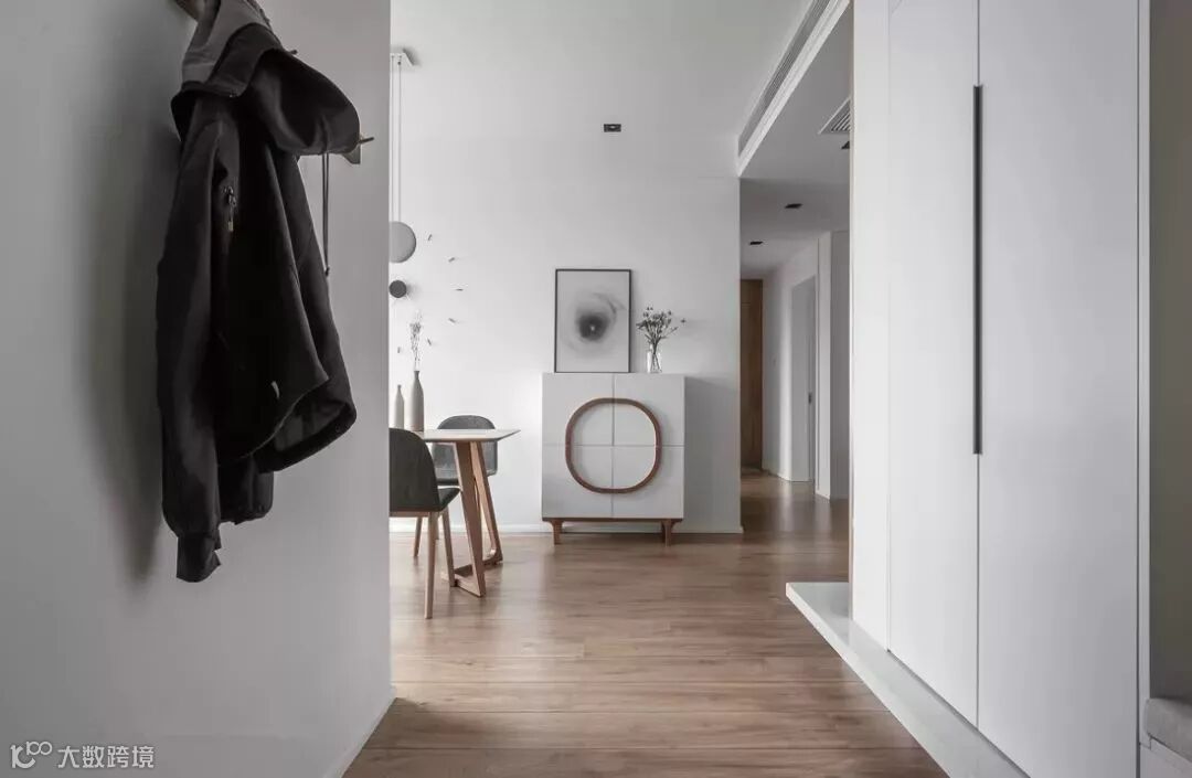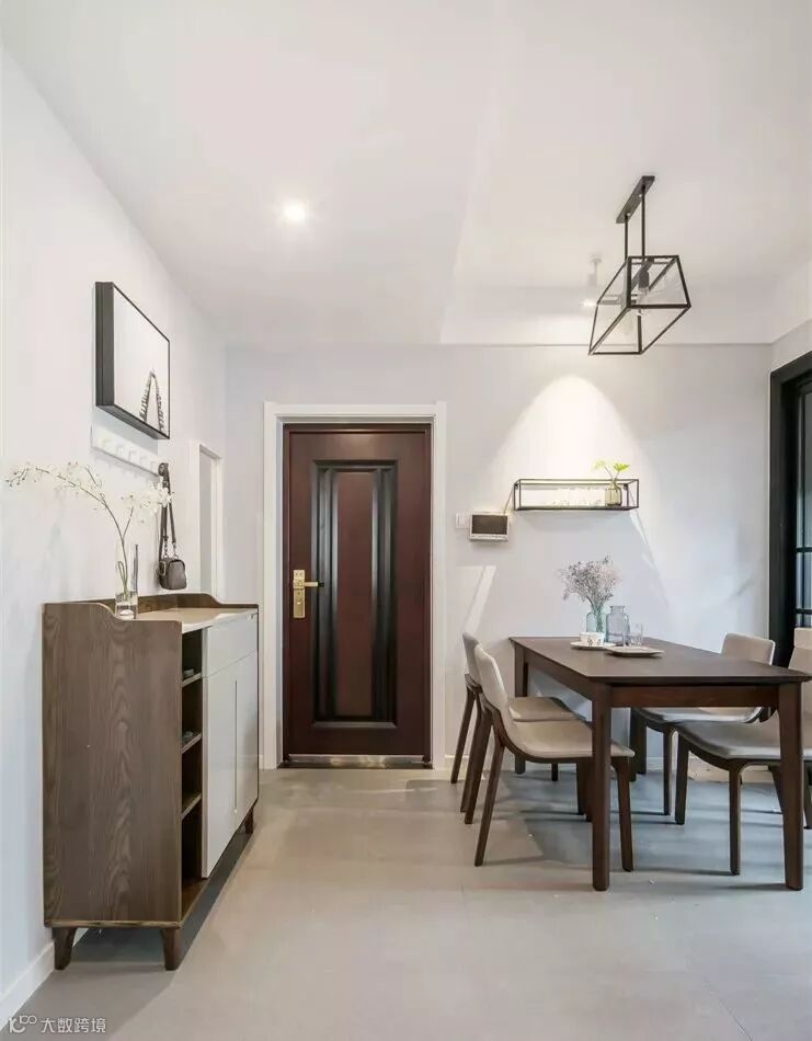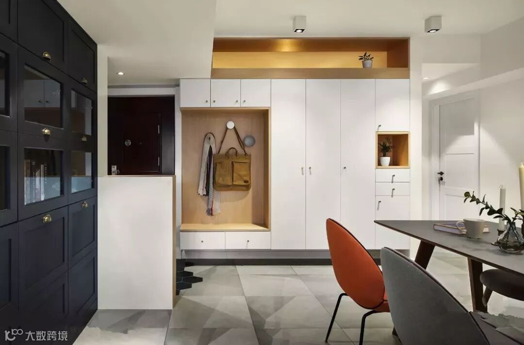 如果你家客餐厅在一条线上,那么可以像下面这样,在入门右手边宽一点的墙面设置玄关柜,左边的窄墙可设计隔板和挂钩,实现强大的置物功能。