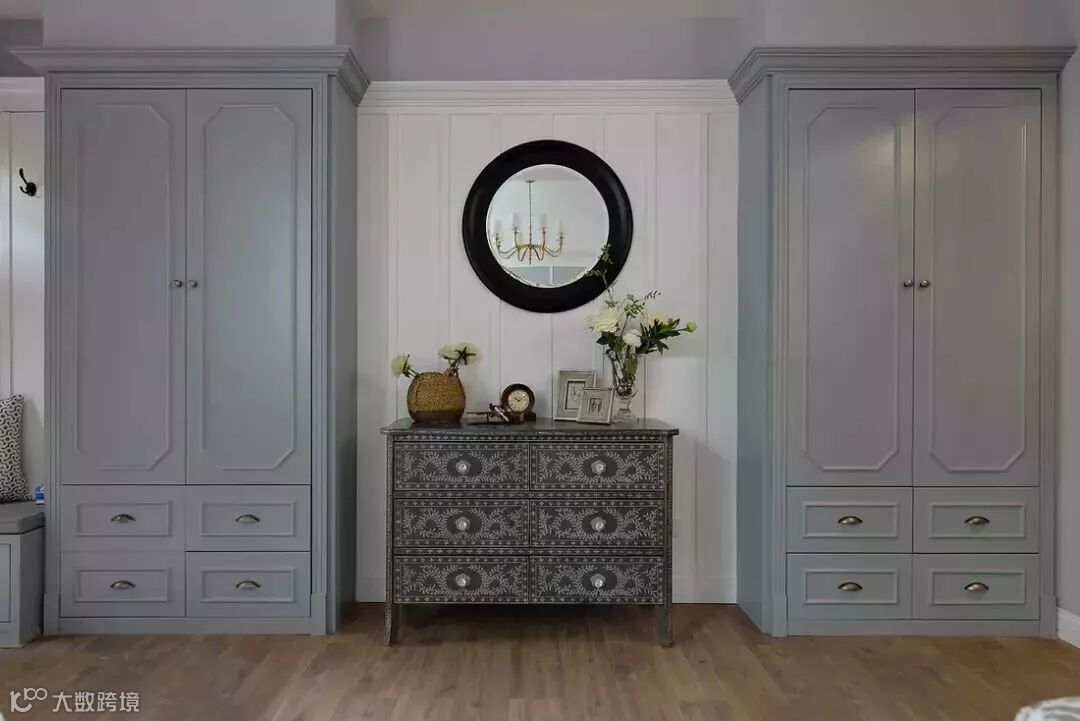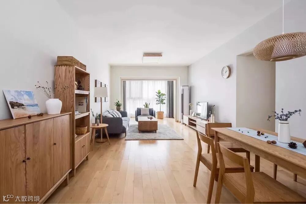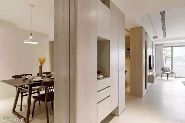 如果进门左边餐厅、右边客厅,想直接设计和墙垂直的玄关柜的话,不仅会让两边的空间都显得非常窄,而且也会阻挡室内光线,但如果将柜子靠墙设置就能解决这个问题。