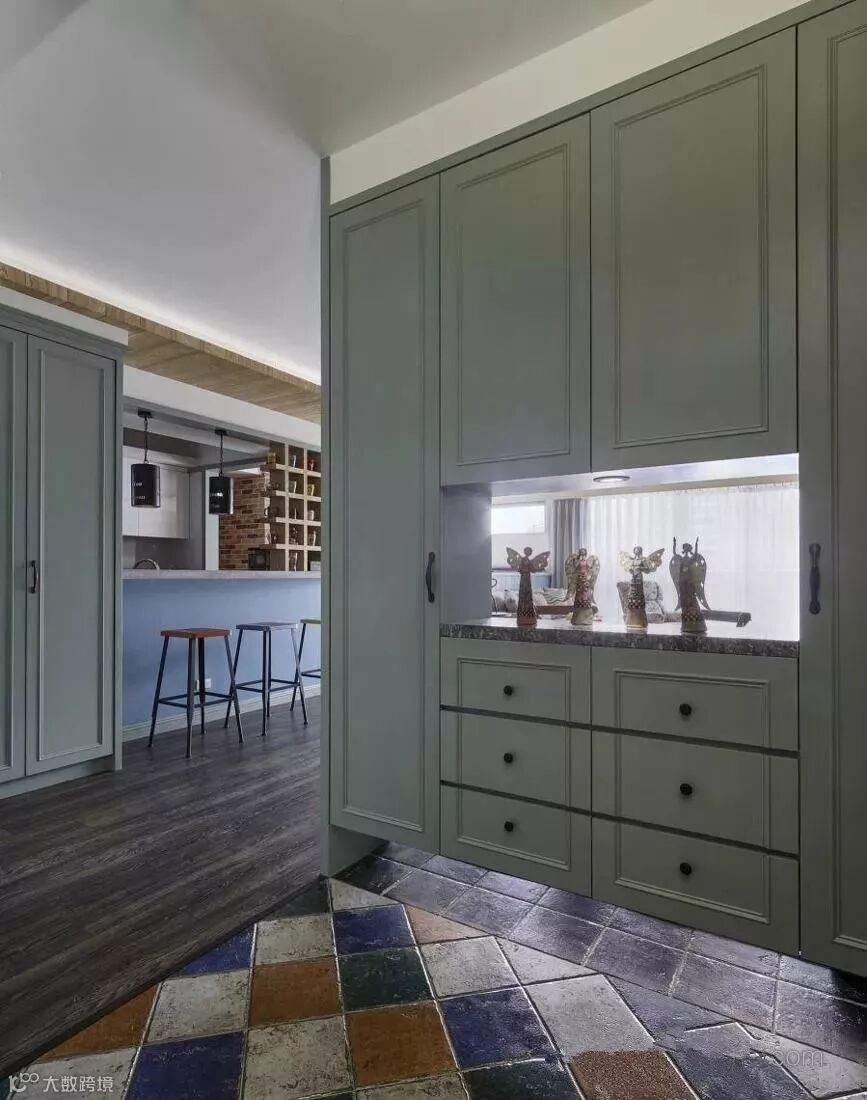 没有空间设置玄关柜怎么办?那就直接顺着墙壁在餐厅这里做一个柜子隔断,使大门处形成一个过道式的玄关,另一侧则是餐厅。这样一来,不仅玄关有了,柜子的收纳能力也是杠杠的,而且还顺带遮挡了餐厅空间,保持了私密性。