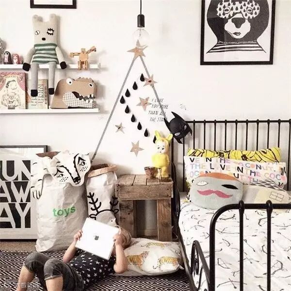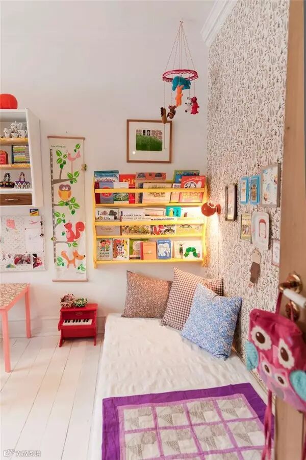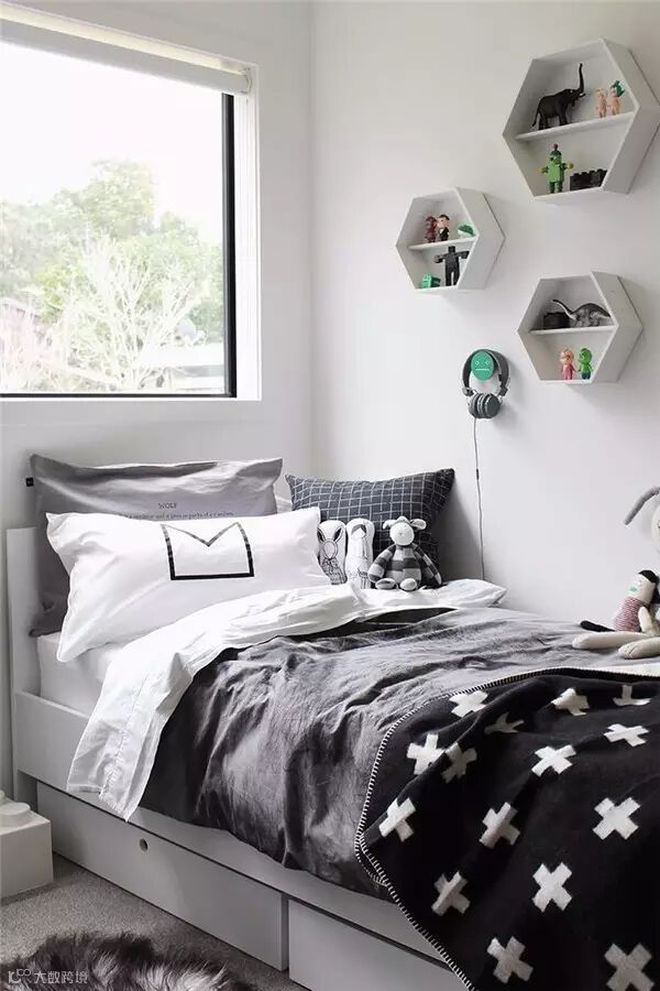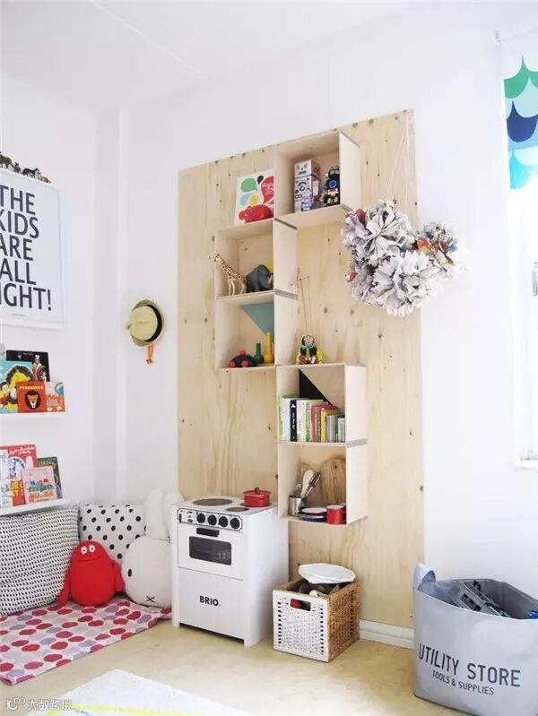或迷你小巧或不规则的搁架是现代家居设计的潮流选择,在儿童房中也同样适用。架子上可以展示孩子喜爱的玩具、饰品等物件,既呈现出不一样的墙面风景,也更能激发孩子学习自主摆放、收纳的探索精神。