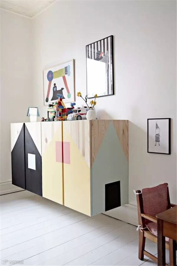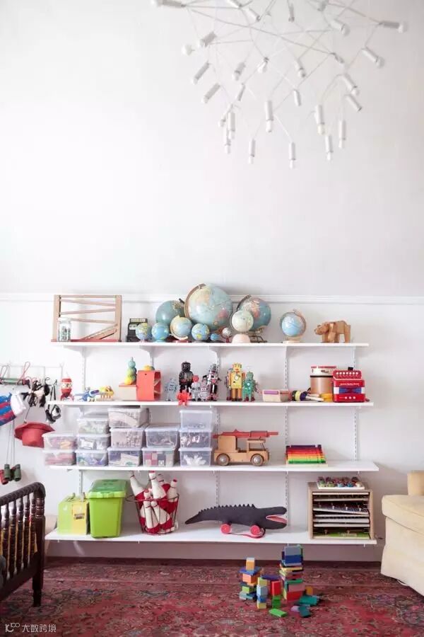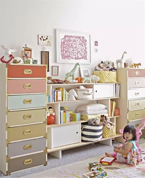 各种高度适中又缤纷多样的收纳柜是儿童房不可缺少的家具,再和藤编篮、布艺桶、塑料筐等收纳工具组合使用,是利用率最广泛的收纳方法。