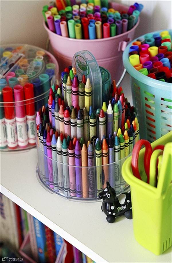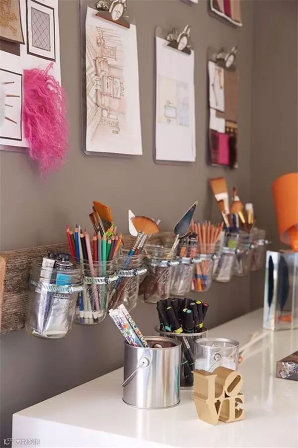 孩子都爱画画,那么各种彩笔等工具想必都被折腾得哪哪儿都是,其实可以分门别类地存放在瓶瓶罐罐里,找起来方便,收拾起来也有针对性。