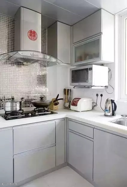 厨房用的银灰色烤漆橱柜,灶台这面背景墙做了银色亮光马赛克,很好看就是不知道是否好清理