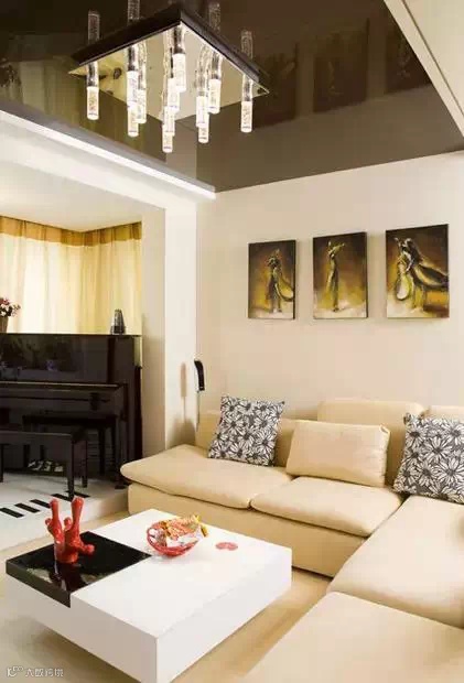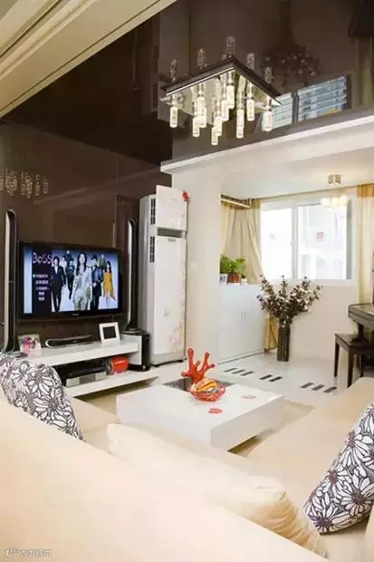 客厅吊顶用了黑玻,也有一定的视觉延伸
