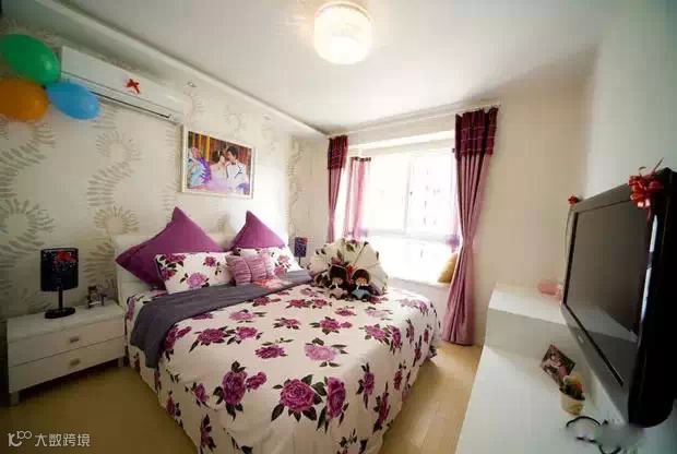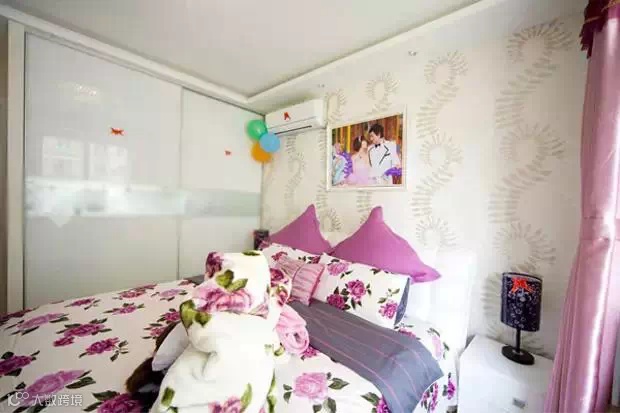 主卧床头铺墙纸,紫色的窗帘和床品显得优雅