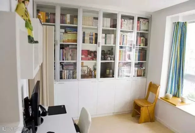 另一面墙是书柜,上半部是带玻璃门的书柜,下半部分是封闭的收纳柜,可以放一些杂物
