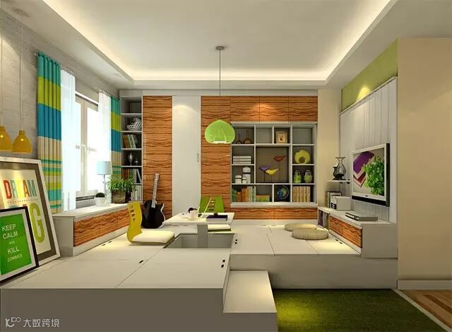 如果房间不够大,可以把整块空间做成地台榻榻米,既可以收纳物件,还能让孩子在上面随便打滚,玩游戏都没问题!
