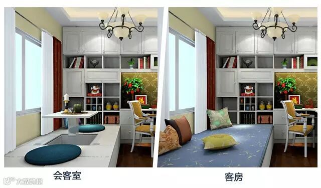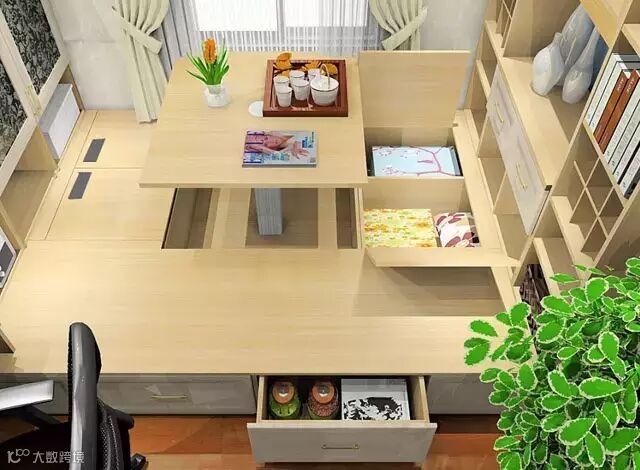 升降台升起来可以当桌椅招待客人,降下来可以当床用。