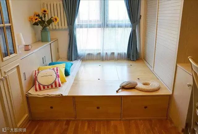 榻榻米底下全部都是储物空间,这些空间不亚于一个大衣柜的收纳容量,再多杂物都能装下。实用!