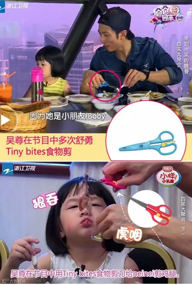 吴尊在《爸爸回来了》节目中多次使用Ting bites辅食剪给自己的女儿剪食物。