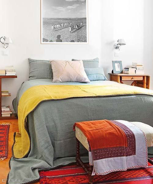8.如果你的卧室颜色偏沉,只需要一条黄色的床单或者红色的地毯,就能点亮卧室,温暖卧室。