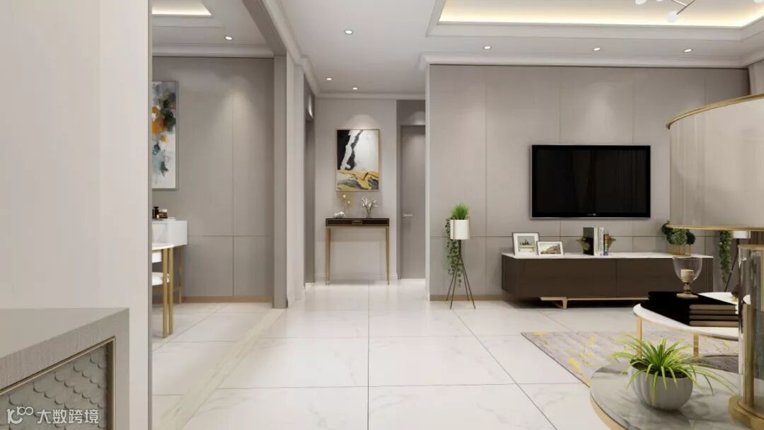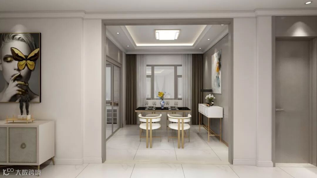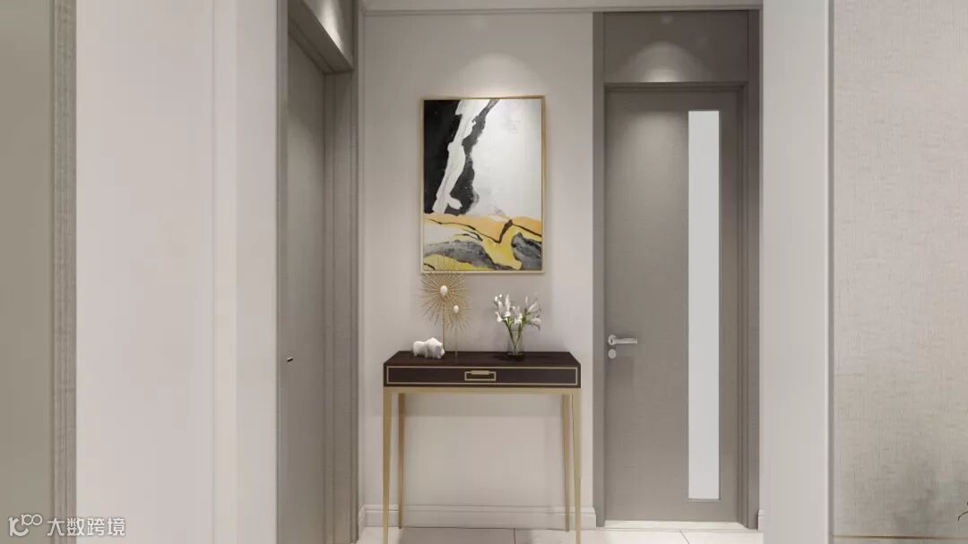 根据两款门的排位布局,在门之间放置了装饰柜以及装饰画,让整个空间突出重点,轻重分明,颜色避免单一。