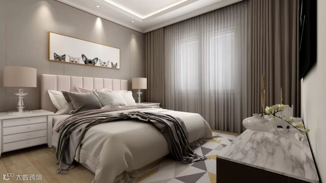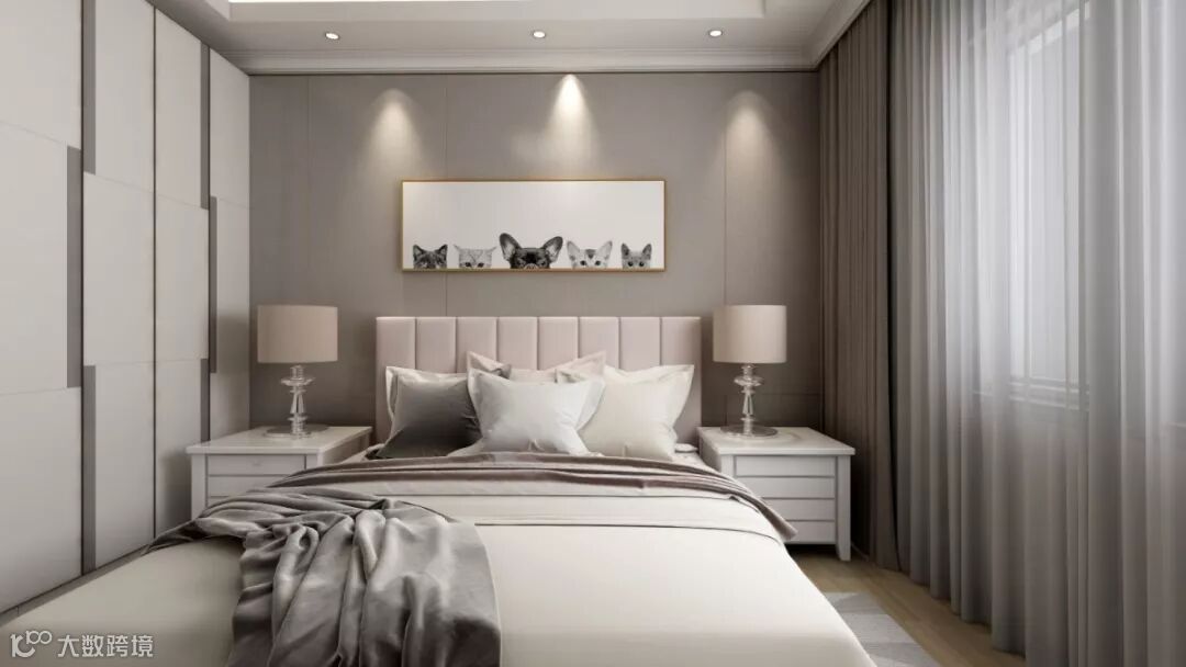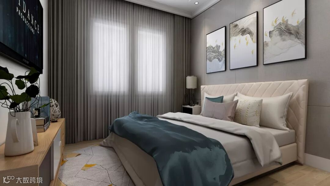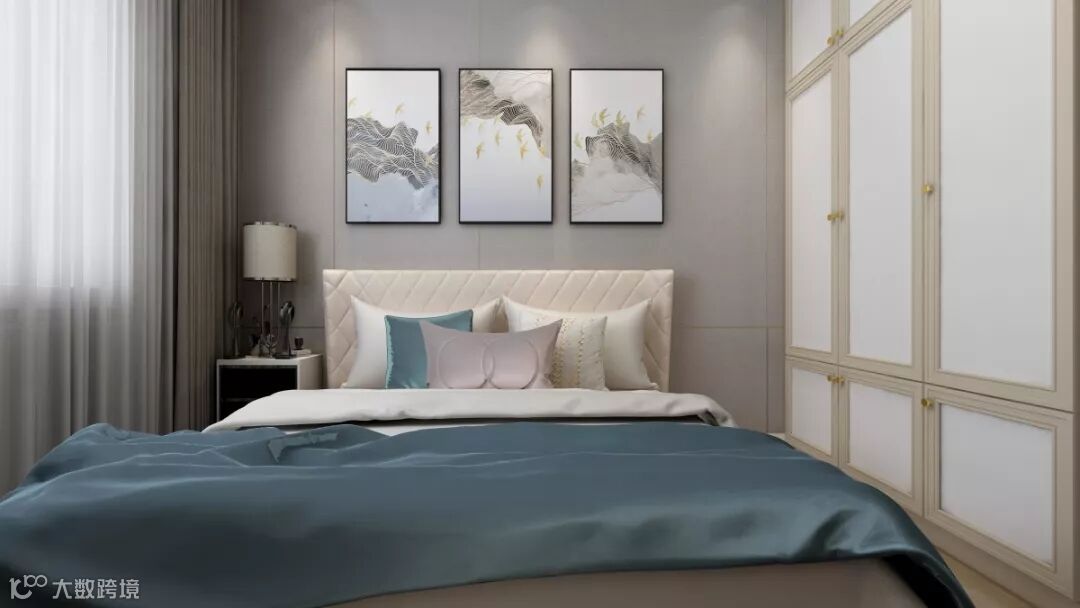 轻奢背景墙搭配金色点缀装饰画,为房间带来了暖意。真丝质感的绸缎提升了生活格调。法兰色作为色彩点缀让生活更加有质感。主体采用了低纯度色彩搭配,利用装饰画来平衡空间,调整比例。柔软的触感让人忍不住触摸,撞击了心底。