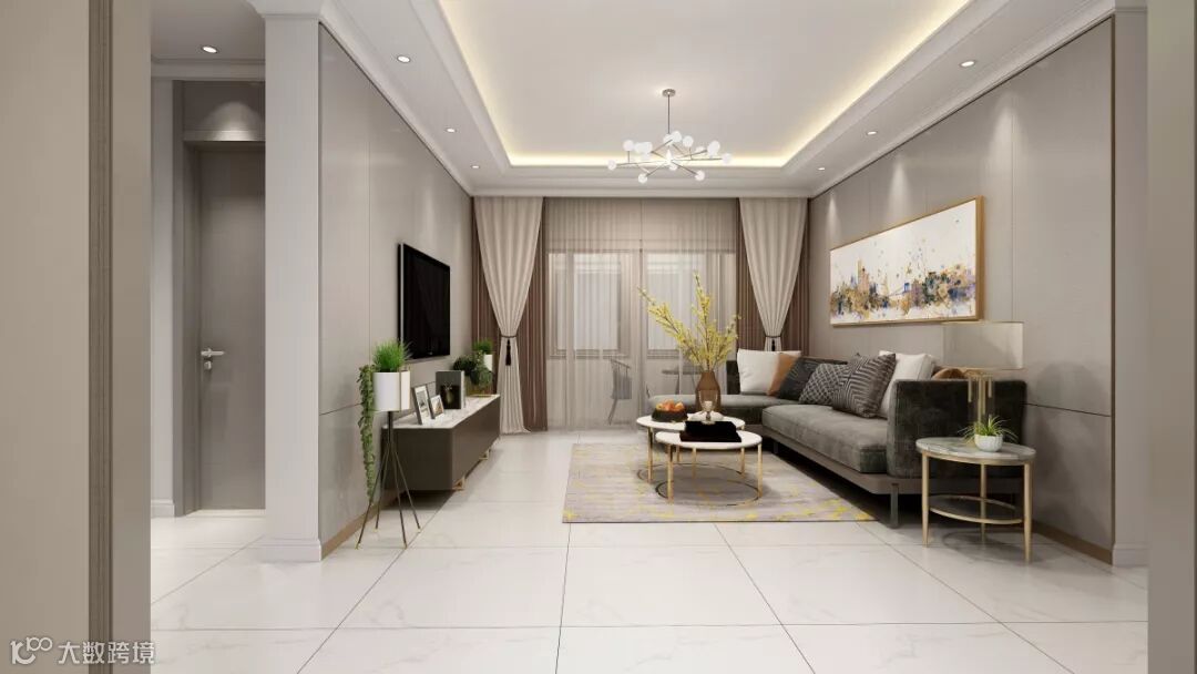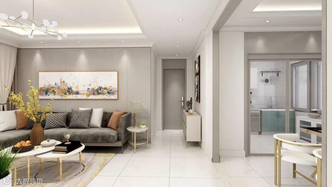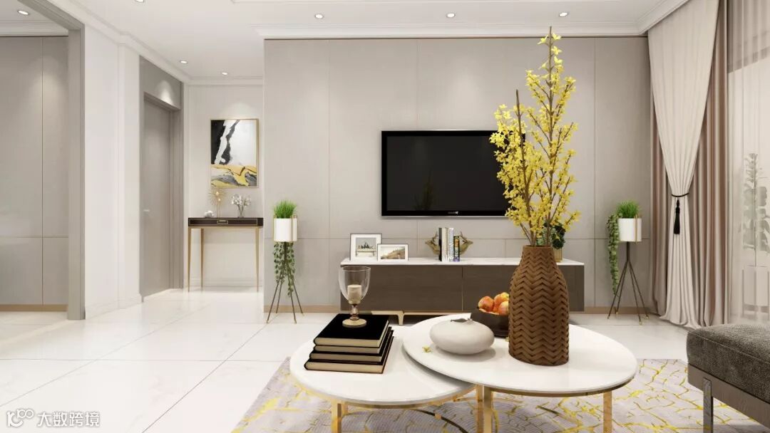 用大面积布纹进行搭配,整个空间静谧带有高贵典雅的色彩。沙发采用高级丝绒材质,透露出品质感,体现别具一格的生活品质。金属茶几搭配金色元素地毯,绿色植物的点缀使整个空间生机勃勃。
