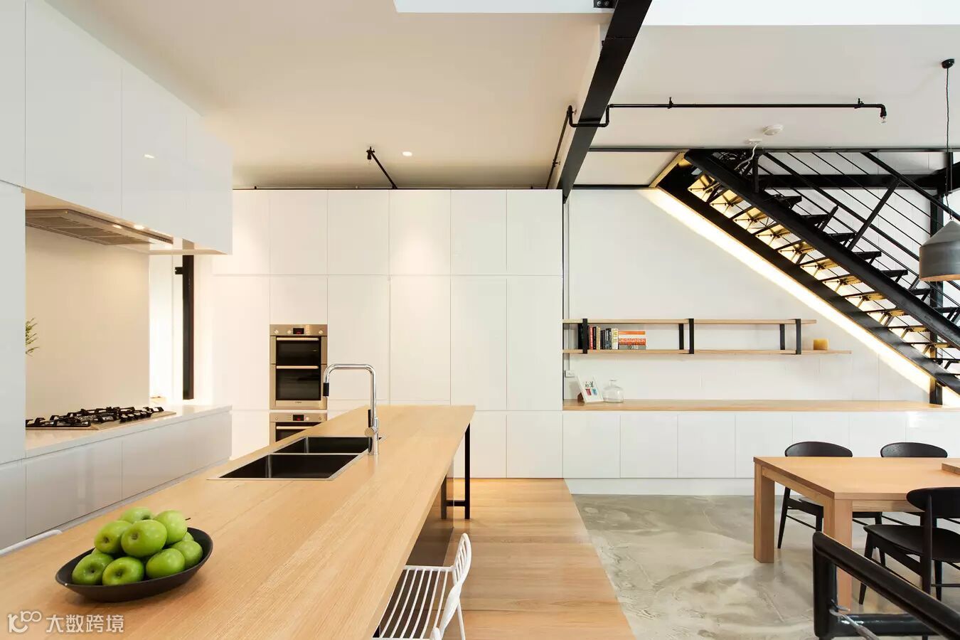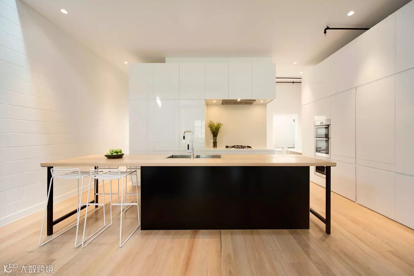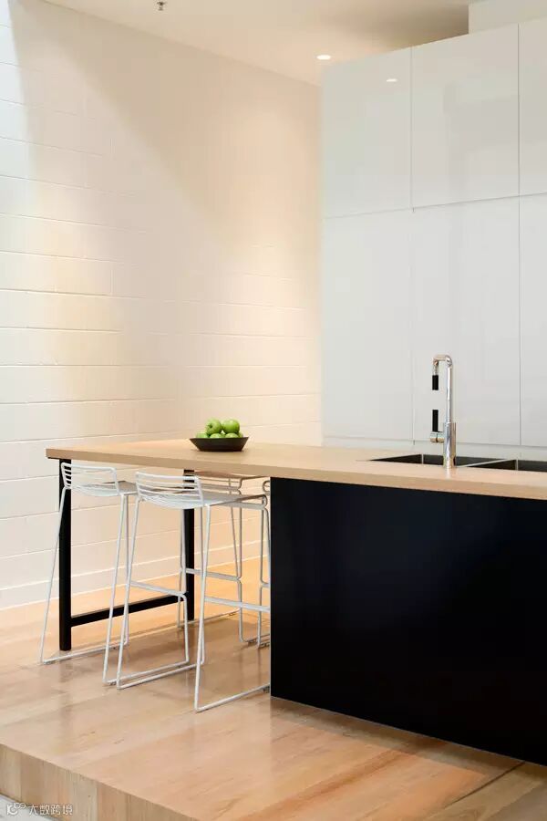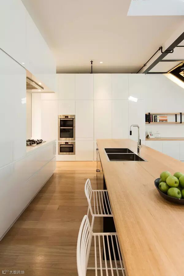 ▲白色厨房的设计保持了现代化的特征,木质台面和地板给空间给人一种舒适和轻松的感觉,厨房用具尽可能减少或者隐藏在柜台后面,整个区域减少了多余的装饰,十分协调。