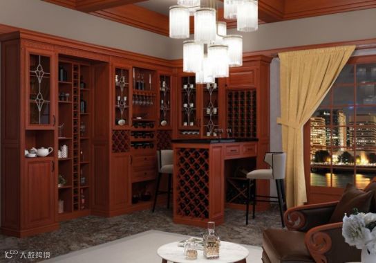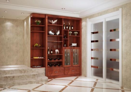 酒柜采用对称设计,半开放式,封闭区可以收纳物品,开放区展示装饰品和红酒。整个酒柜大气,设计独特,能够体现主人高品位的生活品质。