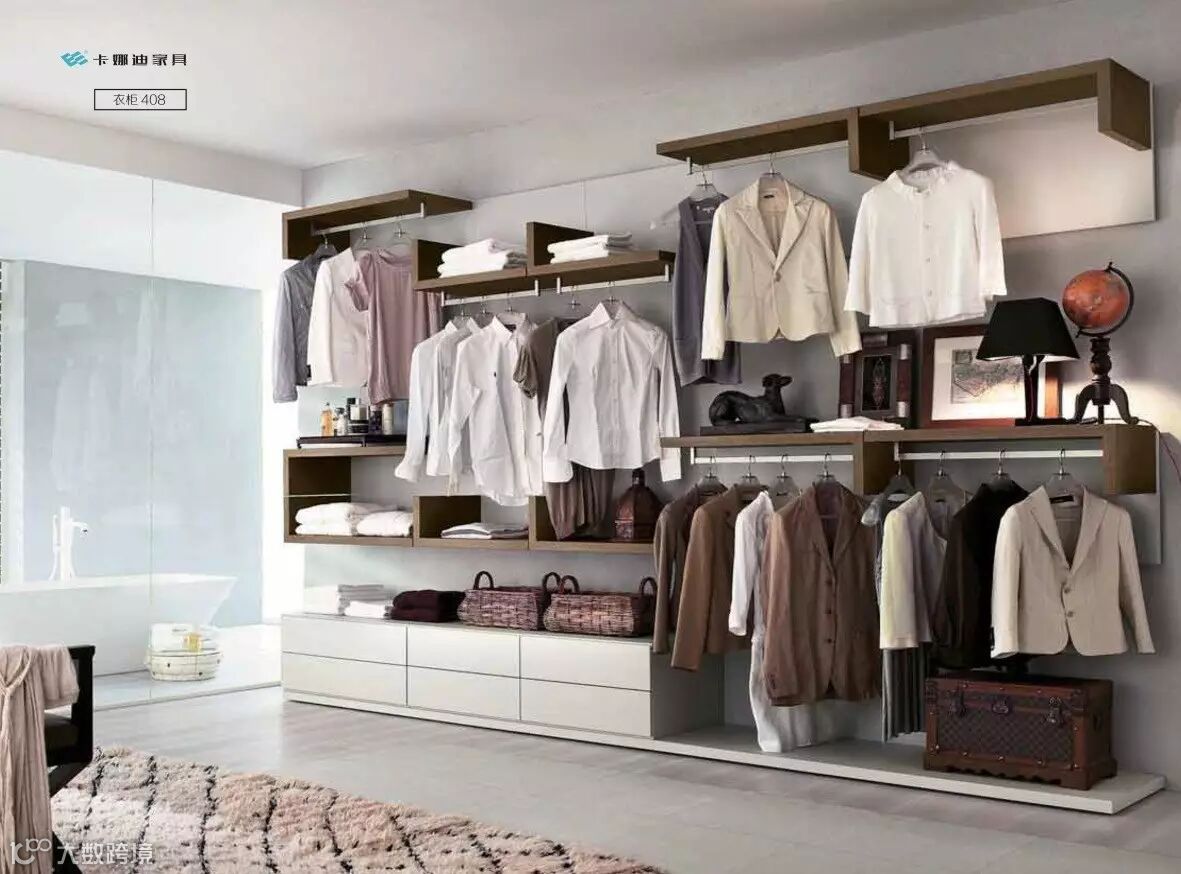 开放式衣柜适合希望在一个大空间内解决所有功能的年轻人。利用一面空墙存放,不完全封闭。空气流通好,宽敞。缺点是防尘差,因此防尘是此类衣柜的重点注意事项,可采用防尘罩悬挂衣服,用盒子来叠放衣物。为便于区别,可增加一些标志。若多设一些抽屉、小柜则更为实用。