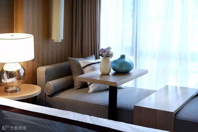 ▲卧室里齐天花板高、贴着墙壁设计了衣柜,床头的背景墙和衣柜的柜门都选择灰色木皮贴板面的材料来装饰,搭配得很得当,配着床头的海景高楼画作,时尚感十足。
