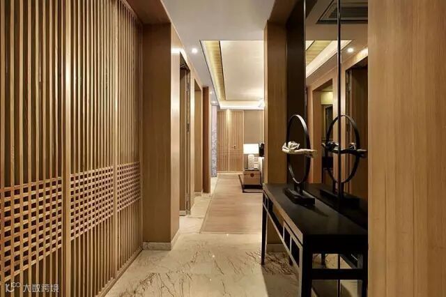 ▲狭长的走道,中式风味十足,一张黑色的家具和墙面镜子装点着走道,让走道不会孤单。