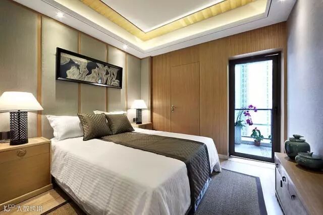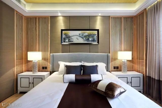 ▲床头两旁的木饰墙装饰效果特别好,床头台灯和装饰画,非常的精致,高雅。