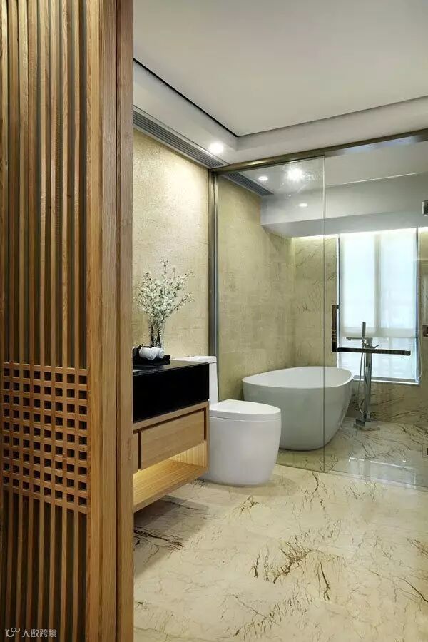 ▲卫浴间用中式栅条屏风移门来闭合,铺着纹理清晰的石材地面,用原木色板材来做卫浴间,搭配着黑色人造石台面,选择玻璃移门来隔断淋浴房,这样干湿区分开,点缀了精致的绿植,清新淡雅又整洁干净。