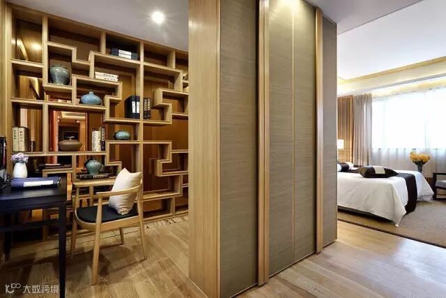 ▲从走道休闲区旁边的灰色门进去就是书房了,博古架设计是中式书房最好的装饰,它有功能的软分割的作用,而且能把整个书房打造出属于中国独特的书斋的味道。