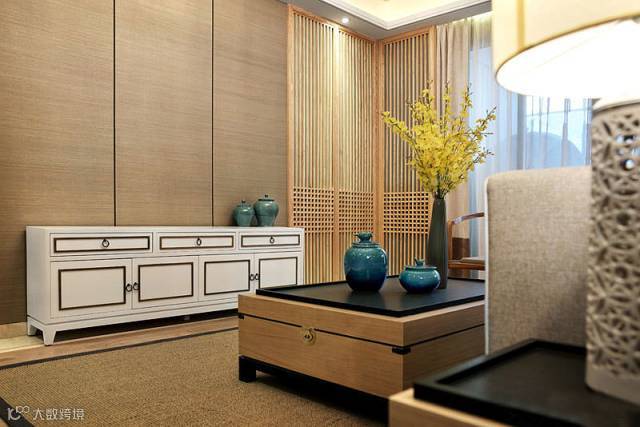 ▲电视背景墙也用浅色木质板材来装饰,旁边还配以中式风格的栅条屏风,白色的电视柜清新淡雅,中式风格的灰蓝色瓷器瓶更是古香古色,这些传统的中式风元素给空间里带来传统韵味的体检。