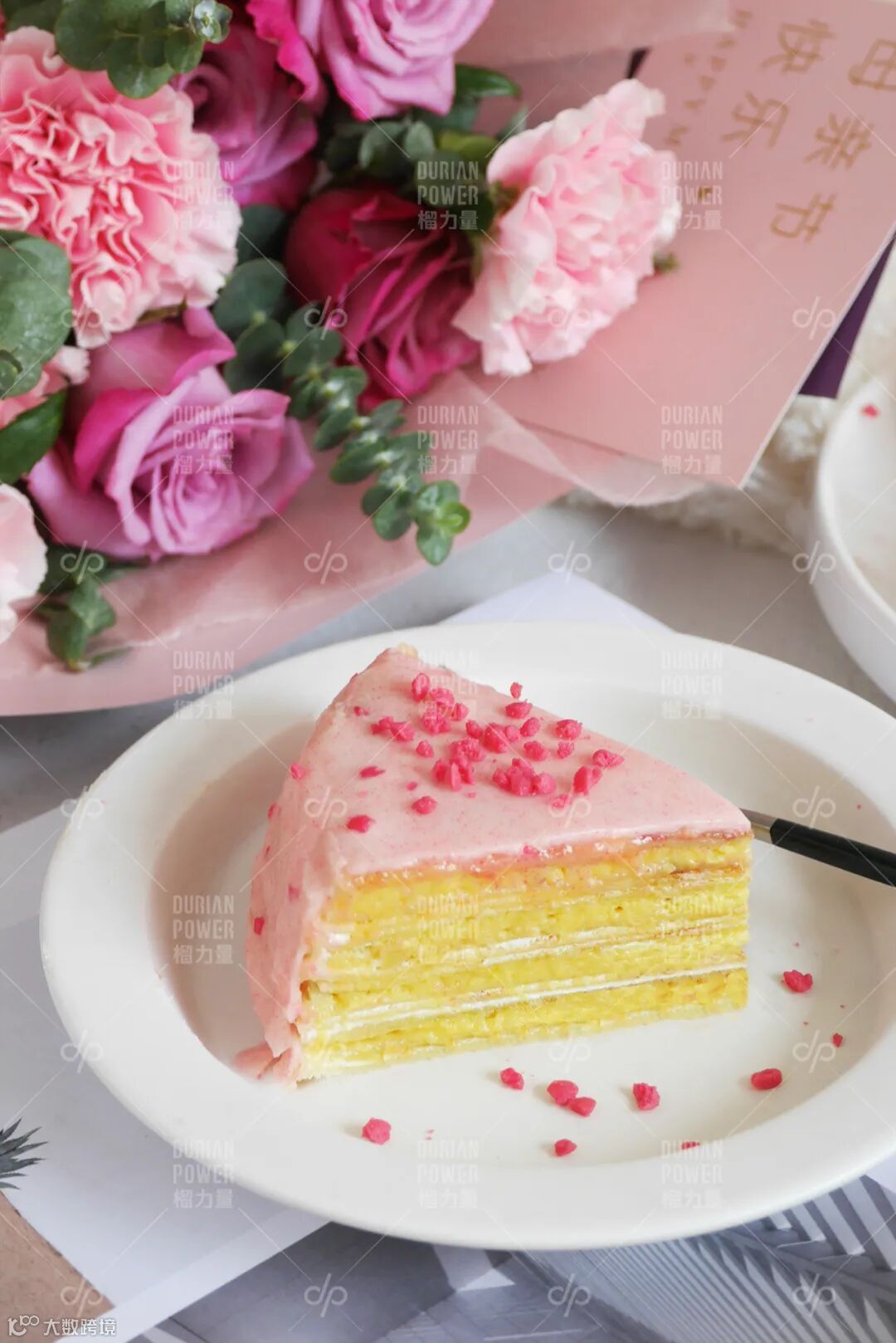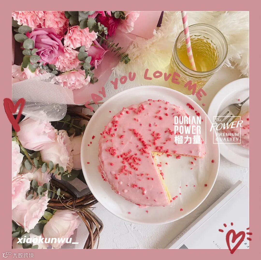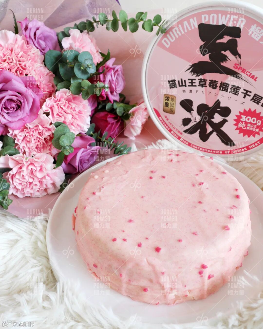 甜蜜少女心的,榴力量延续猫山王千层300g一口一个榴莲的梦幻口感标准,原本浓郁的黑巧克力浇头,换成了粉玫瑰的粉,回忆的粉,粉色果仁巧克力