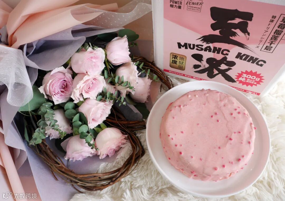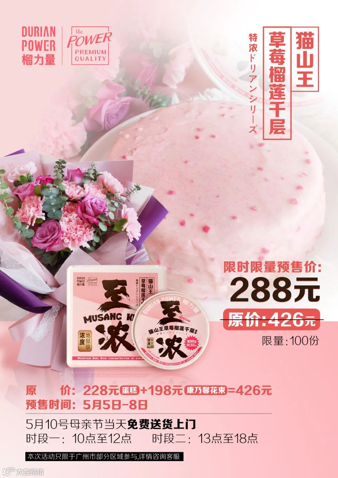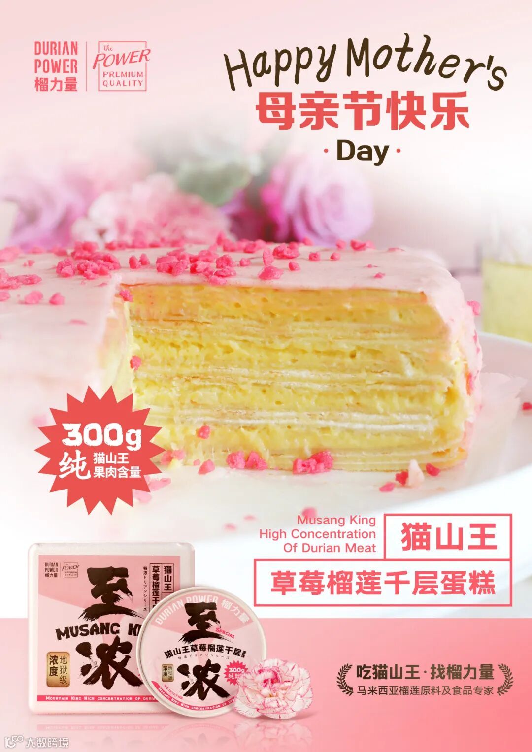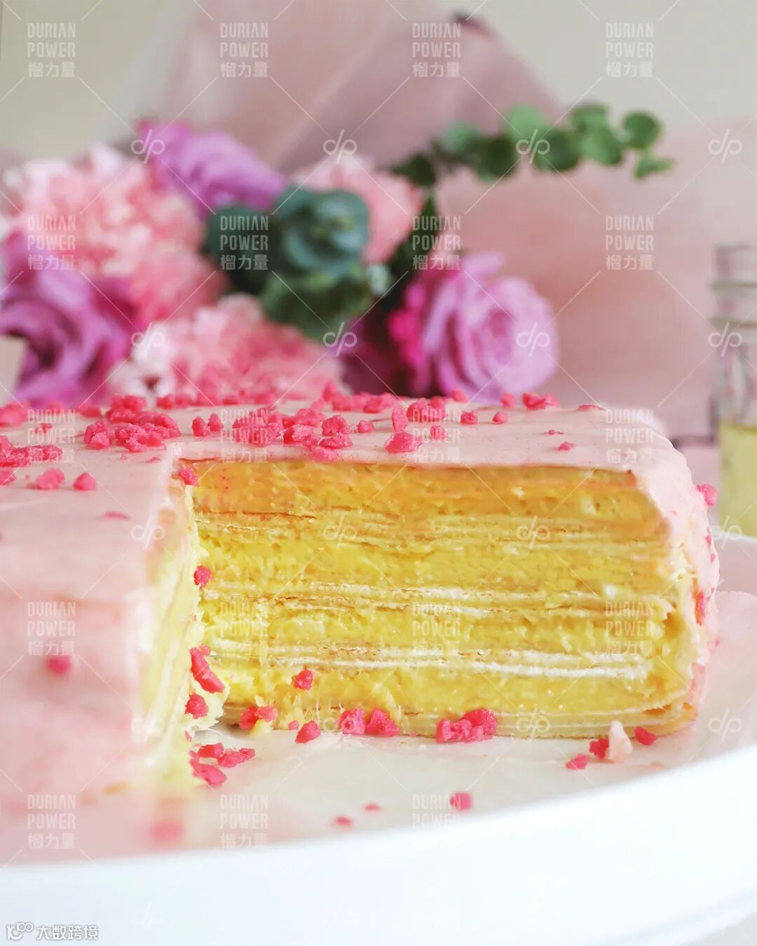 甜蜜少女心的,榴力量延续猫山王千层300g一口一个榴莲的梦幻口感标准,原本浓郁的黑巧克力浇头,换成了粉玫瑰的粉,回忆的粉,粉色果仁巧克力